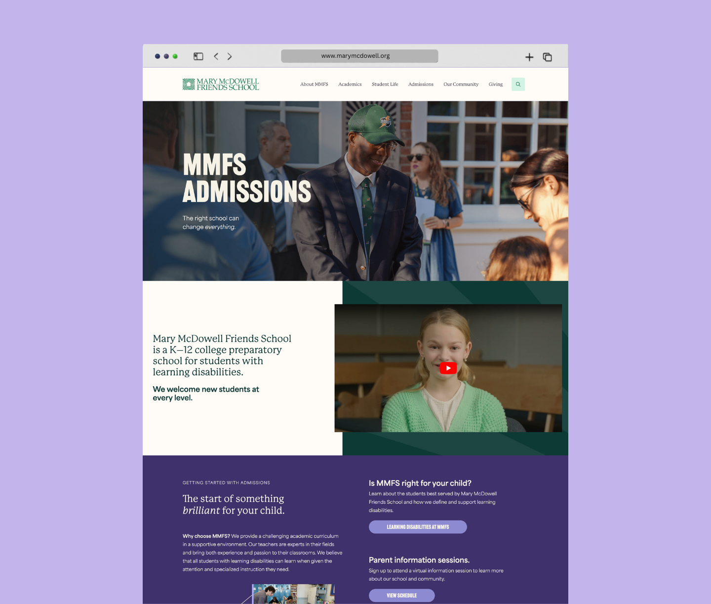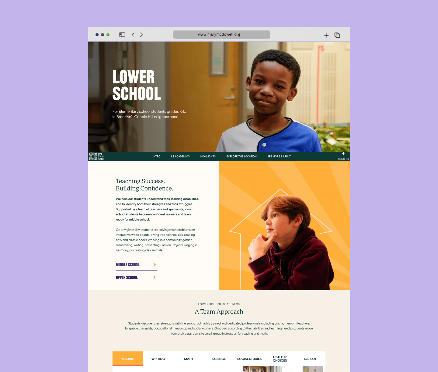 We softened MMFS’s hallmark green and shifted it to an accent role, building the palette around soft cream and deep forest green, balanced with muted purples, rich red, and a bright yellow to symbolize brilliance. Typography balanced warmth and rigor: Railroad Gothic ATF gave punchy energy to display headlines, P22 Mackinac Pro carried elegance for section headlines, and Area Normal provided clarity and accessibility for body copy, especially for dyslexic readers. This balance underscored the school’s rigorous academic program while keeping the design modern and approachable.